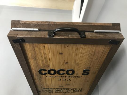 宮崎県のアパレルショップ、COCOS様からのご依頼で スタンド看板を製作しました。 フレーム、板面共に木材で製作。 意匠はカッティングシートとアルミ複合板の切文字です。 既製品のスタンド看板と比べると 個性的かつオシャレで味のある看板となりました。