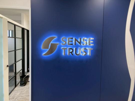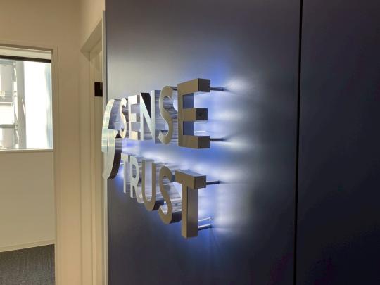 事務所エントランスにバックライト仕様のチャンネル文字を施工しました。 発光体は白色LEDですが、紺色の下地に反射することで青みがかった光を放ちます。 美しいグラデーションで空間全体が上質な印象に仕上がりました。
